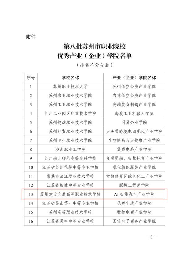 近日,根据《关于公布第八批苏州市职业院校优秀产业(企业)学院名单的通知》(苏教职〔2025〕18 号)文件通知,我校汽车工程学院“AI 智能汽车产业学院”获评苏州市职业院校优秀产业(企业)学院。